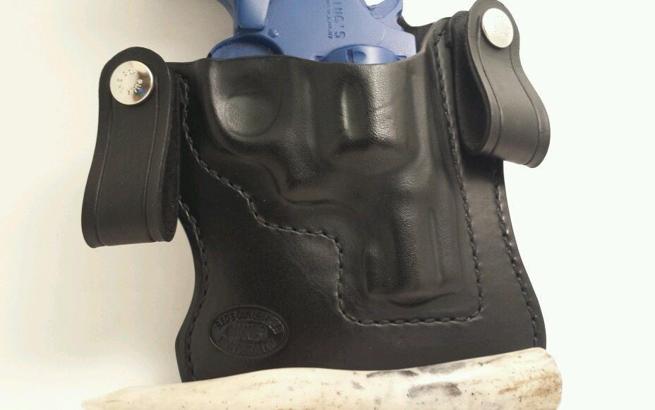 Red's Deep Concealment IWB features widely spaced snap and loop assemblies that ensure even weight distribution of even the heaviest firearms. Constructed of two pieces of handpicked, American veg tanned leather,this holster's sleek design offers incredible comfort and concealability. Features hand boning, molded sight channel, and a full sweat shield. Holster rides at an 18-20 degree forward cant.