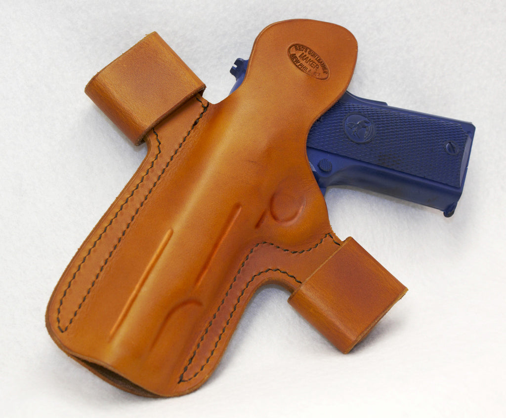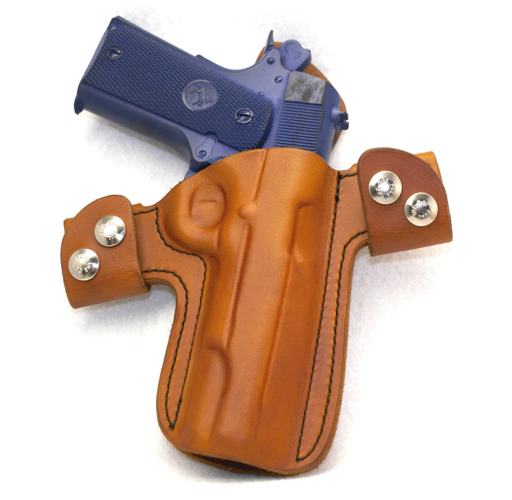 Red's Snap-on Pancake holster features two snap and loop assemblies, allowing for easy on and off use. The wide spacing of the loops helps distribute the weight of your pistol evenly for all day comfort. Like all of our holsters, the Snap-on features hand boning, a molded sight channel, and water resistant finish. Riding at an 18-degree forward cant, this holster is perfect for concealment or a variety of other uses.